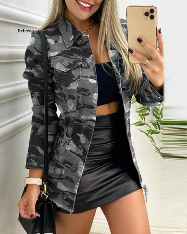 Fashion Autumn Casual Women Long Sleeve Jacket Upper Outer Garment Camouflage Print Buttoned Pocket Design Coat